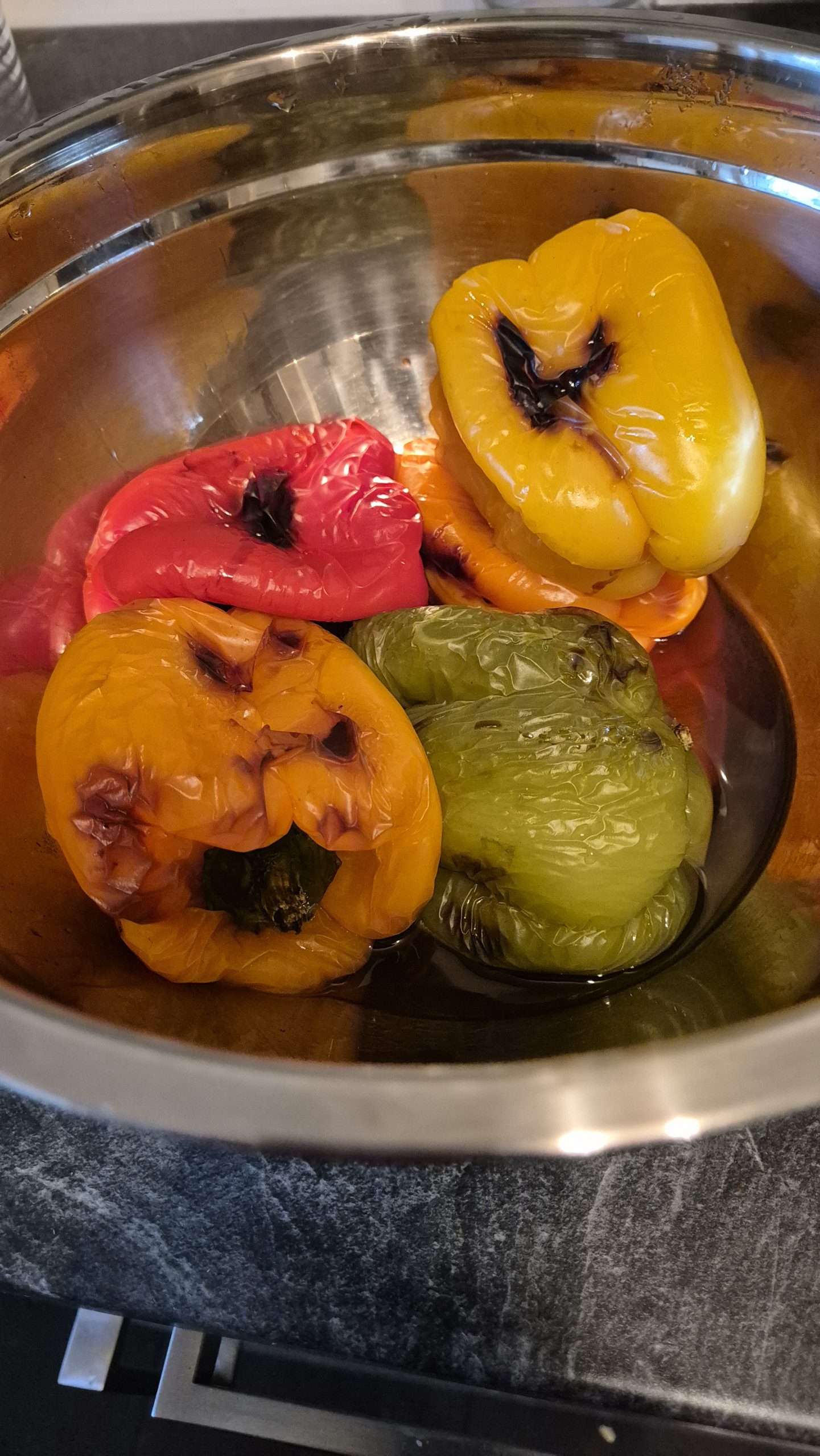 Es dauert ungefähr eine Stunde und Sie sollten die Paprikaschoten nicht früher rausholen , da es dann schwieriger ist, die gesamte Schale von den Paprikaschoten zu entfernen.